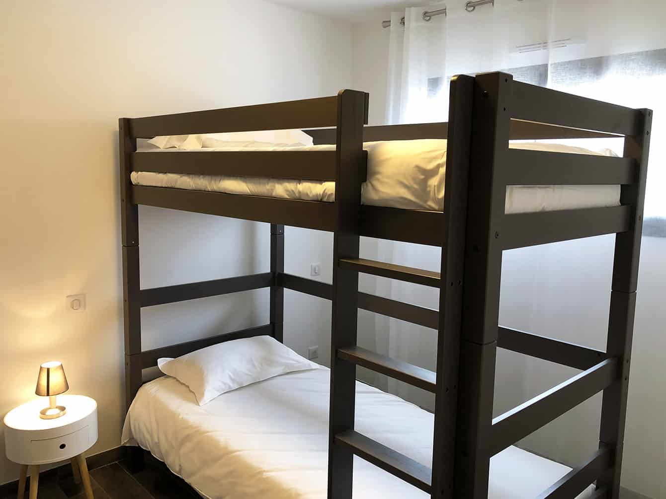 Die 7 Schlafplätze (2 Doppelzimmer und 1 Dreibettzimmer mit Einzelbetten für die Kinder) sind perfekt auf einer großzügigen Fläche von 95m² verteilt. 2 Badezimmer, 2 separate WCs und ein Wohnzimmer mit voll ausgestatteter amerikanischer Küche vervollständigen die gehobene Ausstattung dieser Mietvilla.