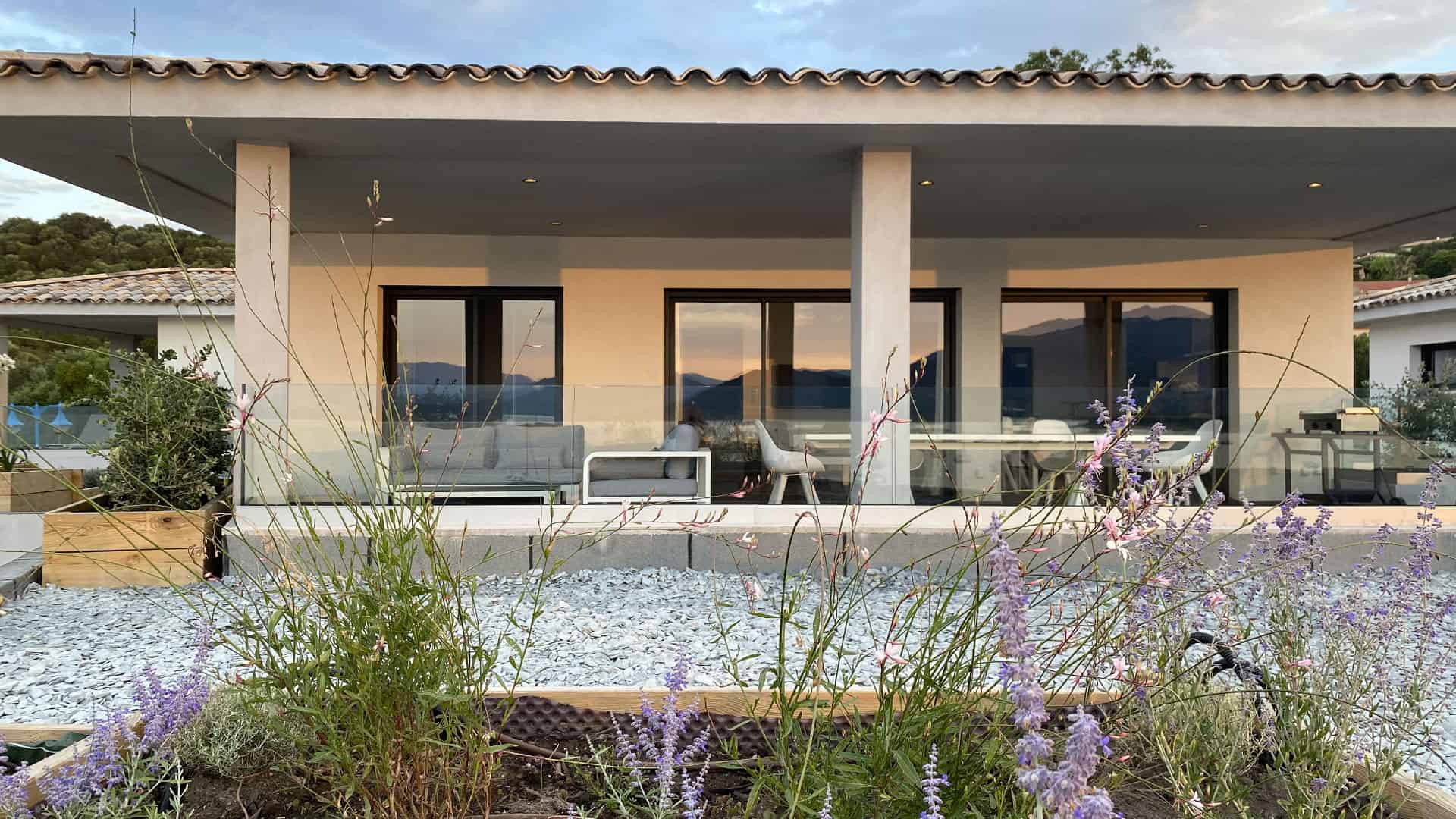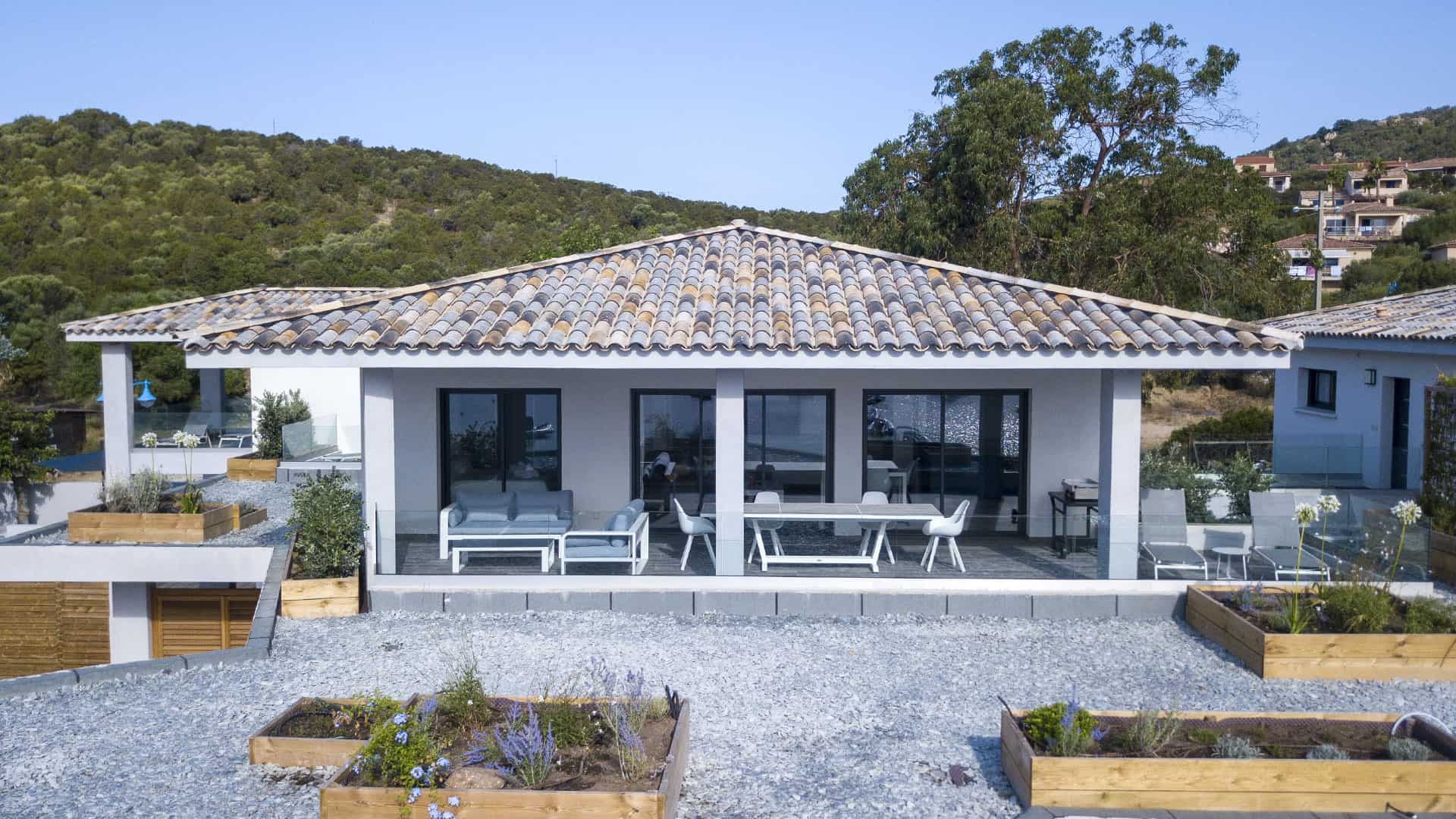 Come avrete capito, la nostra villa n°7 è stata allestita sul “tetto” della residenza Capriona. La bellezza di questa villa da sogno è evidente in ogni dettaglio. La sua altezza le conferisce una vista maestosa sul mare. La sua splendida terrazza di 52 m², abbinata a un’ampia area piantumata, la distingue sottilmente dagli altri alloggi della residenza. È in questa bolla di comfort e morbidezza che iniziano le vostre vacanze in Corsica.
